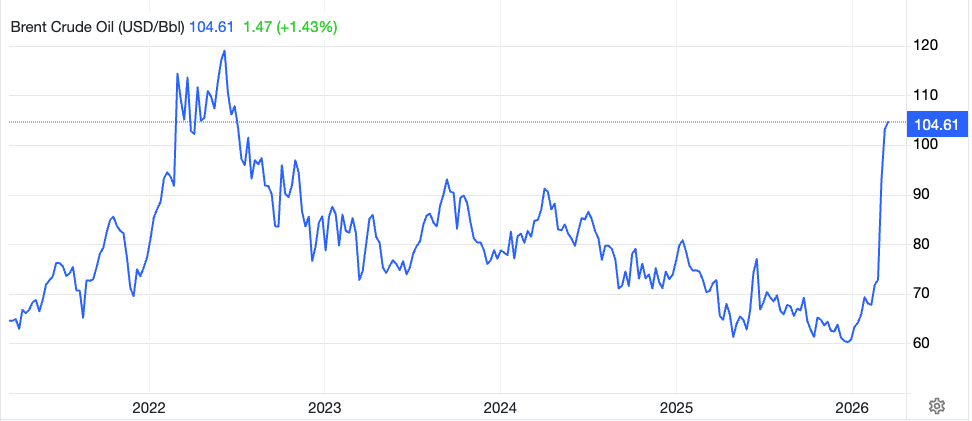 Brent Crude Oil prices have surged past $104 per barrel, marking their highest level since July 2022.